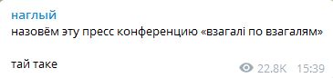 "Назовём эту пресс конференцию "взагалі по взагалям" тай таке" - написал журналист Макс Назаров, которому сегодня также не дали задать вопрос.