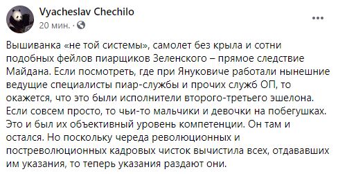 "Вышиванка "не той системы", самолет без крыла и сотни подобных фейлов пиарщиков Зеленского – прямое следствие Майдана. Если посмотреть, где при Януковиче работали нынешние ведущие специалисты пиар-службы и прочих служб ОП, то окажется, что это были исполнители второго-третьего эшелона. Если совсем просто, то чьи-то мальчики и девочки на побегушках. Это и был их объективный уровень компетенции. Он там и остался. Но поскольку череда революционных и постреволюционных кадровых чисток вычистила всех, отдававших им указания, то теперь указания раздают они" - написал журналист.