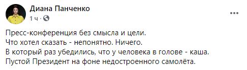 "Пресс-конференция без смысла и цели. Что хотел сказать - непонятно. Ничего. В который раз убедились, что у человека в голове - каша. Пустой Президент на фоне недостроенного самолёта".