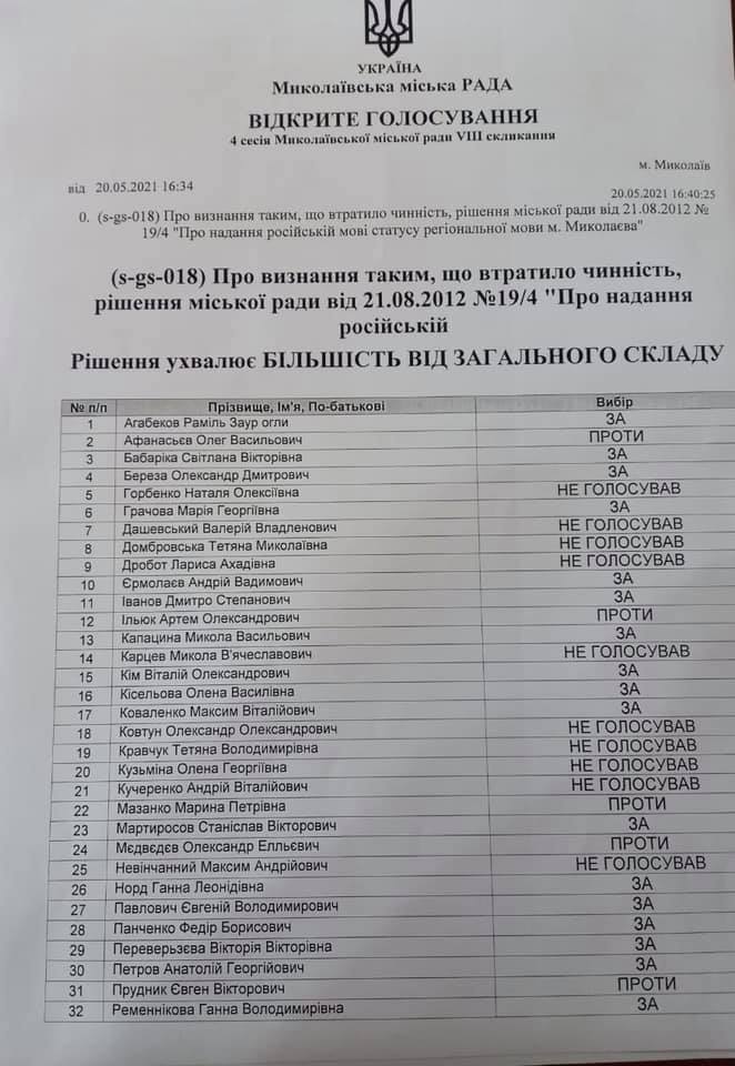 Во время заседания Николаевского городского совета 20 мая депутаты высказались против или не участвовали в голосовании по отмене решения 2012 года о предоставлении русскому языку статуса регионального. В итоге этот статус остался за языком.