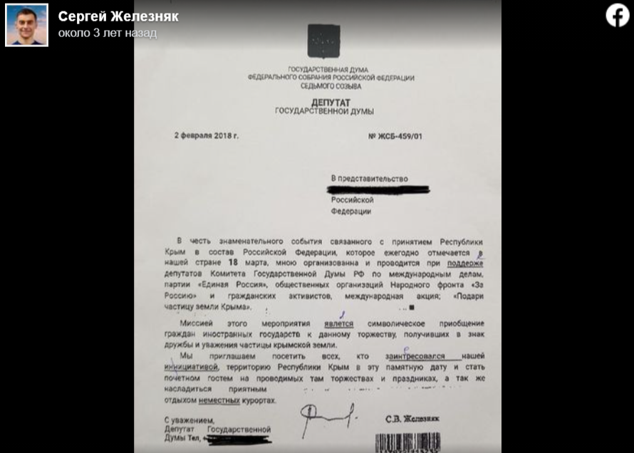 Как пишет издание, по данным Федеральной службы безопасности (ФСБ), письма отправлялись, "очевидно, пытаясь дестабилизировать обстановку и поссорить Россию с другими странами", Такие послания направляли в посольства иностранных государств, руководителям НАТО и Евросоюза на поддельных бланках депутата Госдумы Сергея Железняка.