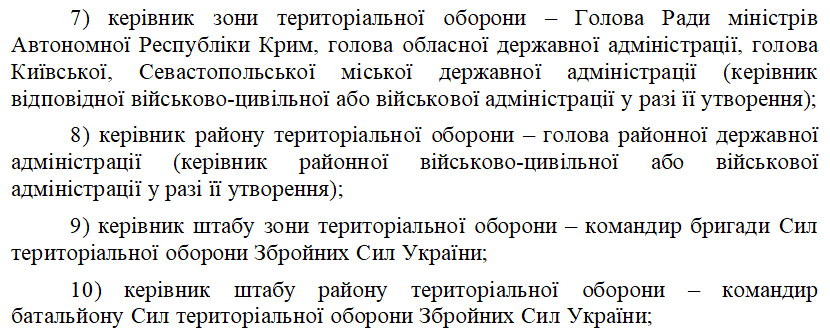 Генштаб управляет этими силами в рамках всей территории Украины. При этом в законопроекте снова делается акцент, что зонами теробороны (то есть областями и районами) командует местный президентский назначенец - глава областной, районной и, например, в Киеве - городской администрации (правда, в Киеве глава администрации и мэр одно и то же лицо, но ходят слухи, что скоро Зеленский уволит с должности главы КГГА Кличко и назначит туда своего человека).