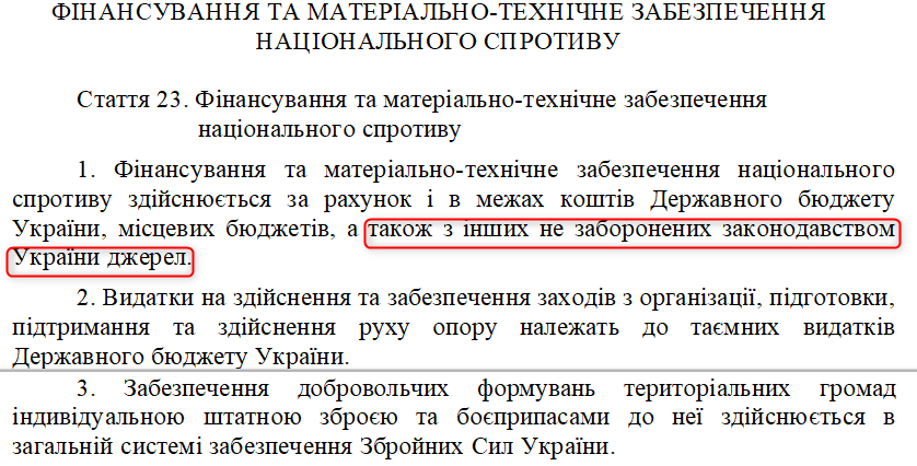 "Финансирование и материально-техническое обеспечение национального сопротивления осуществляется за счет и в пределах средств Государственного бюджета Украины, местных бюджетов, а также из других не запрещенных законодательством Украины источников".