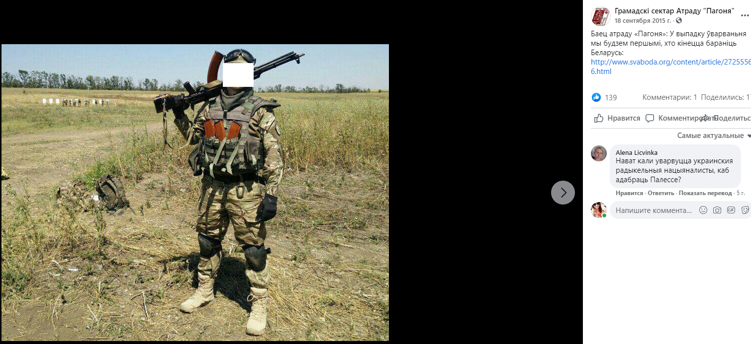 По словам Кима, он прикреплен к отряду "Пагоня", который входит в "Азов" ("Пагоня" - это герб, который использует белорусская оппозиция). На Фейсбук-странице "Пагони" есть также фото, публиковавшееся выше, но с замазанным лицом.