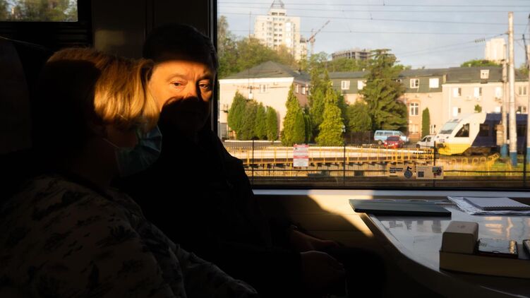 В Киеве поезд, перед отправлением в Донецкую область, перевели на соседний путь. Как сообщают очевидцы, вероятно, это было сделано для удобства экс-президента Петра Порошенко, который вместе с Ириной Геращенко отправлялся на Донбасс в этом поезде.