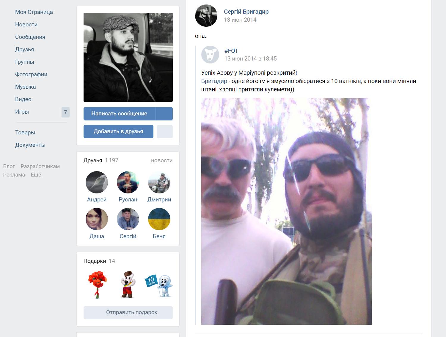 Гораздо больше о Бригадире рассказывает его ныне удаленная страница в социальной сети ВКонтакте, которую он активно вел с 2014 по 2016 как "Серёжа Бригадир", публикуя там многочисленные селфи, указывающие на аутентичность выложенных материалов.