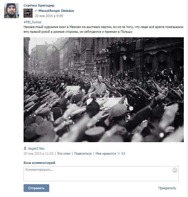 Год, тогда еще служащий в "Азове", Бригадир начал с фотографий с Гитлером. Он репостит шутку "Мизантропик Дивижн" (об этой организации "Страна" подробно писала ранее), в которой Гитлер представлен художником, который, из-за обилия "зиг" на улицах, заблудился и попал вместо выставки картин в Польшу.