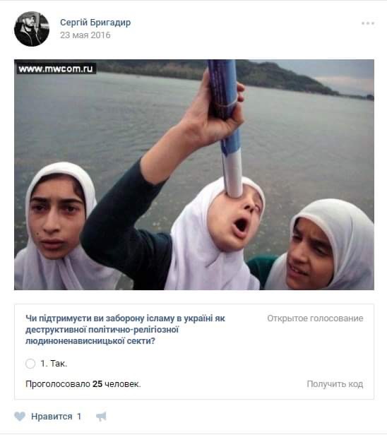 В июне 2016 автор странички создал опрос в соцсети "поддерживаете ли вы запрет ислама в Украине как деструктивной политико-религиозной человеконенависнической секты?"