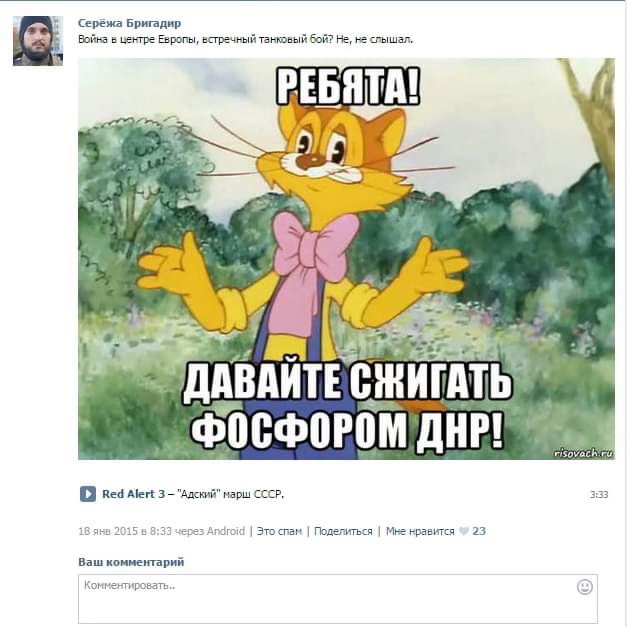 После обещания "исправиться" после "оставления в живых сепаров", Бригадир перешел к конструктивным предложениям. Например, публикации картинок с призывом сжигать "ДНР" фосфором.