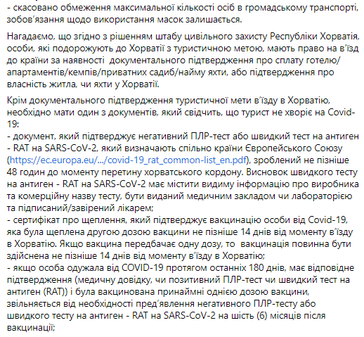 В публикации также идет речь о том, что согласно решению штаба гражданской защиты Республики Хорватия, лица, путешествующие в Хорватию с туристической целью, имеют право на въезд в страну при наличии документального подтверждения об уплате отеля/апартаментов/Кемпа/ астных усадеб/yайма яхты, или подтверждение о собственности жилья, или яхты в Хорватии.