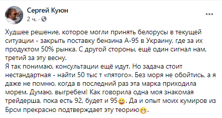 "Худшее решение, которое могли принять белорусы в текущей ситуации - закрыть поставку бензина А-95 в Украину, где за их продуктом 50% рынка. С другой стороны, ещё один сигнал нам, третий за эту весну", - написал Куюн.