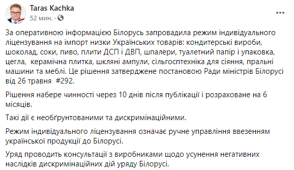 "По оперативной информации, Беларусь ввела режим индивидуального лицензирования на импорт ряда украинских товаров: кондитерские изделия, шоколад, соки, пиво, плиты ДСП и ДВП, обои, туалетная бумага и упаковка, кирпич, керамическая плитка, стеклянные ампулы, сельхозтехника для посева, стиральные машины и мебель", - говорится в сообщении.