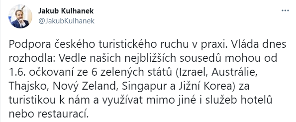 А с 1 июня, в Чехию смогут въехать вакцинированные граждане Израиля, Австралии, Таиланда, Новой Зеландии, Сингапура и Южной Кореи, заявил министр иностранных дел Якуб Кулханек в Twitter.