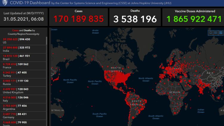 По данным на 31 мая число зараженных на Земле превысило уже 170 миллионов, фото: университет Дж. Хопкинса