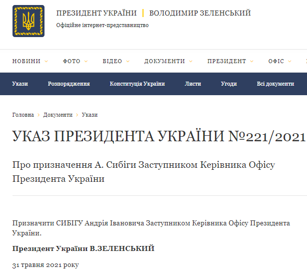 Указ №221/2021 президента Владимира Зеленского об этом назначении опубликован на сайте главы государства.