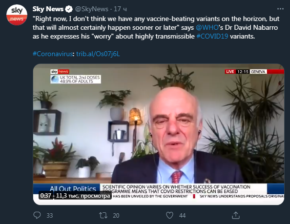 Об этом со ссылкой на посланника Всемирной организации здравоохранения по борьбе с пандемией коронавируса доктора Дэвида Набарро в Twitter сообщает Sky News.