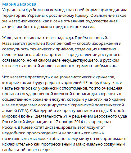 "То, что Украина делает с Евро, очень печально. На этом фоне украинцы собираются играть в форме, на которой Крым является частью их территории. Получается, что чемпионат становится ареной политических разборок. И теперь это решение украинских спортивных функционеров заставит многих людей говорить не о празднике футбола, а о политических заявлениях. "Молодцы", больше ничего не скажешь. Собрались и наворотили", - написала Канделаки.
