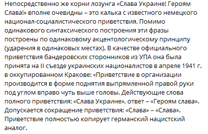 "В качестве официального приветствия бандеровских сторонников из УПА она была принята на II съезде украинских националистов в апреле 1941 г. в оккупированном Кракове: «Приветствие в организации производится в форме поднятия выпрямленной правой руки под углом вправо чуть выше головы. Действующие слова полного приветствия: "Слава Украине", ответ – "Героям слава". Допускается сокращение приветствия: "Слава" – "Слава". Приветствие полностью копирует германский нацистский аналог", - написала представитель МИД РФ.