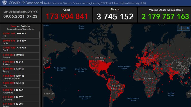 По данным на утро 9 июня, число зараженных на Земле приближается к 174 миллионам, фото: arcgis.com