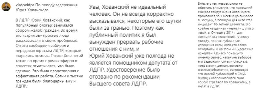 "Почему-то именно сейчас, накануне выборов его задержали силами спецназа, предъявили демонстративно жесткие обвинения, сопроводив это массой публикаций в СМИ. Выводы напрашиваются сами собой: стреляют по Хованскому, а метят в ЛДПР", – написал Власов в Instagram.