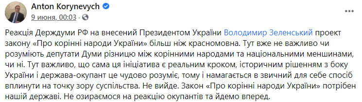 На российскую критику сразу после постановления Госдумы начали отвечать в Украине. Представитель Зеленского по Крыму Антон Кориневич предложил "не оглядываться на реакцию оккупантов и идти вперед".