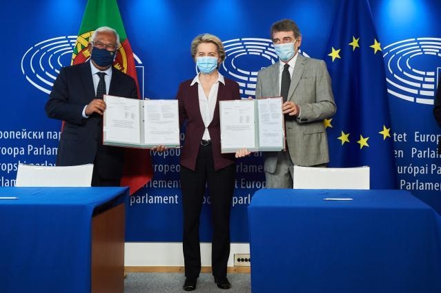 На церемонии по случаю внедрения цифровых Covid-сертификатов в ЕС присутствовали премьер-министр Португалии, председательствующей в ЕС, Антонио Коста, президент ЕС Урсула фон дер Ляйен, глава Евроарламента Давид Сассоли. Фото: ec.europa.eu