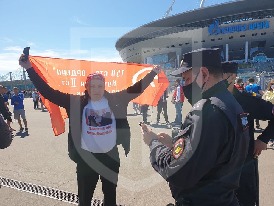 15:00 Полиция не пустила на стадион в Санкт-Петербурге болельщика в футболке с фото Путина и Лукашенко, которые пожимают друг другу руки.
