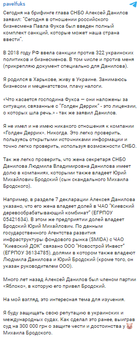 Бизнесмен считает, что санкции, которые теперь уже бьют по его другим активам, – месть со стороны Данилова, чья жена является партнером врага Фукса, бизнесмена Михаила Бродского, совладельца сайта "Обозреватель".