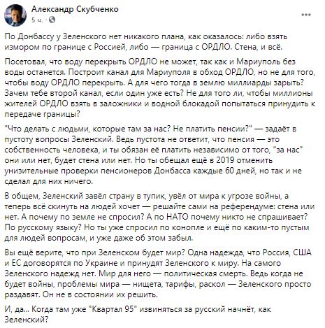 В общем, Зеленский завёл страну в тупик, увёл от мира к угрозе войны, а теперь всё скинуть на людей хочет — решайте сами на референдуме: стена или нет" - написал Александр Скубченко.