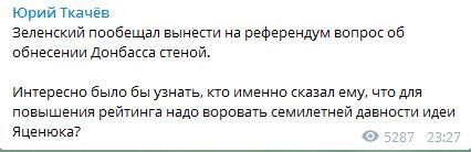 "Владимир Зеленский неспособен установить мир и объединить страну. Из-за некомпетентности и политической несостоятельности он не смог урегулировать конфликт на Донбассе. Теперь он рассуждает о возможности строительства стены на границе с этим украинским регионом. Подобно безответственным политикам-авантюристам, Зеленский хочет использовать усталость людей от войны. Заставить их на референдуме принять решение о расчленении страны.