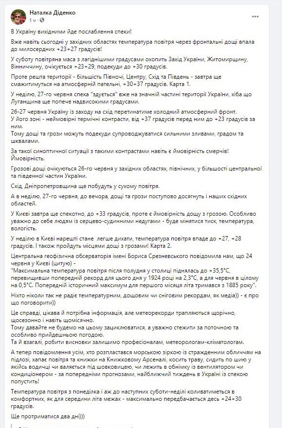 "26-27 июня Украину с запада на восток пересечет холодный атмосферный фронт. В его области ожидается от + 37 градусов перед ним и до + 23 градусов за ним. Поэтому дожди и грозы могут сопровождаться сильными ливнями, градом и шквалами. Ещё два дня держимся", - пишет она.