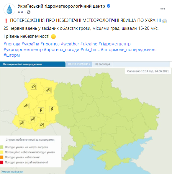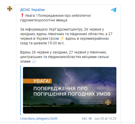 "По информации УкрГидрометцентра, 26 июня в западных, днем северных и южных областях, а 27 июня в Украине грозы днем в отдельных районах град и шквалы 15-20 м/с", - говорится в сообщении.