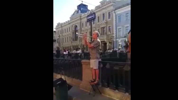 В российском Санкт-Петербурге уличный музыкант сыграл на трубе гимн Украины. Никто из очевидцев, даже люди в форме, не пытались помешать мужчине.