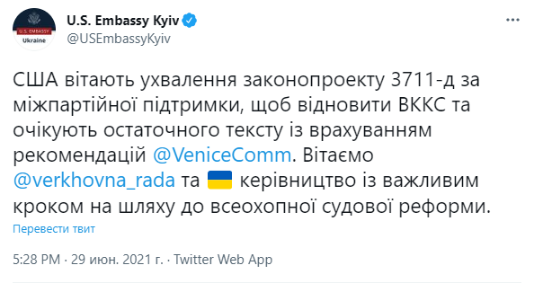 "США приветствуют принятие законопроекта 3711-Д при поддержке различных партий, цель которого обновить Высшую квалификационную комиссию судей, и с нетерпением ждут окончательный текст документа с учетом рекомендаций Венецианской комиссии. Поздравляем Верховную Раду и руководство Украины с важным шагом на пути к комплексной судебной реформы", - говорится в сообщении.