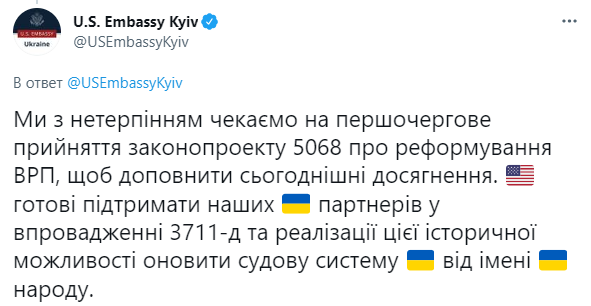 Также американские дипломаты добавили, что с нетерпением ждут быстрого принятия законопроекта №5068, который предусматривает аналогичные принципы формирования Высшего совета правосудия.