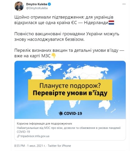 "Только что получили подтверждение: для украинцев открылась еще одна страна ЕС - Нидерланды. Полностью вакцинированные граждане Украины могут снова наслаждаться безвизом", - написал Кулеба.