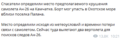 Самолет летел из Петропавловска-Камчатского в поселок Палана. В настоящее время спасатели определили место предполагаемого крушения авиалайнера. Борт упал в Охотское море вблизи поселка Палана. Туда летят два вертолета для поисков следов Ан-26.