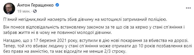 Также Геращенко напомнил, что с 17 марта вступили в действие новые наказания за убийства на дороге. Согласно новым правилам, тот, кто убивает человека в состоянии опьянения может получить до десяти лет лишения свободы без права на амнистию, и должен отсидеть не менее 2/3 срока.