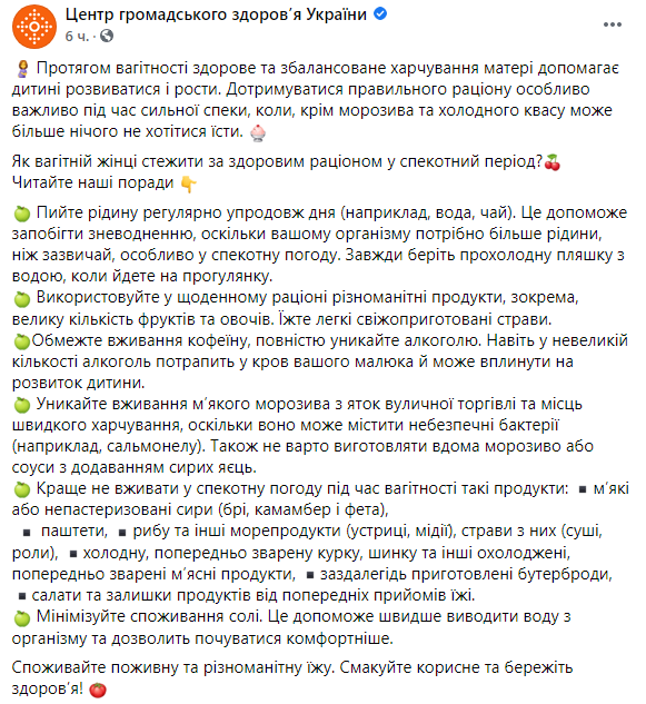 В понедельник, 12 июля, представители Минздрава рассказали беременным украинкам, как правильно питаться в жаркий летний период.
