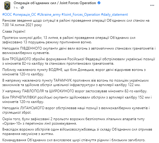 Также там добавили, что за прошедшие сутки, 13 июля, в районе проведения операции ОС зафиксировано 13 нарушений режима прекращения огня.