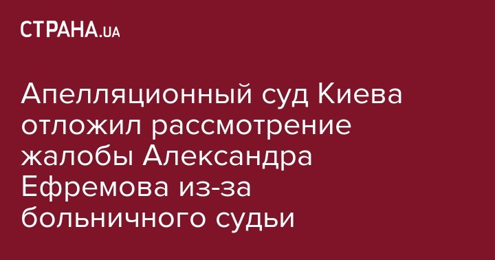 "Рассмотрение апелляционной жалобы, поданной в интересах подозреваемого А.С.Ефремова отложено до 10 октября 2016 года (14 час. 45 мин.) В связи с пребыванием судьи-докладчика Рыбака И.А. на больничном", - указано в сообщении пресс-службы Апелляционного суда Киева.