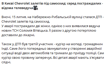 "Ночью, 15 июля, на Набережно-Рыбальской улице произошло ДТП - Chevrolet залетел под самосвал. В аварии пострадали две женщины, одной из них оказалась ведущая новостей ТСН Соломия Витвицкая. Ее вместе со второй потерпевшей доставили в больницу", - говорится в сообщении.