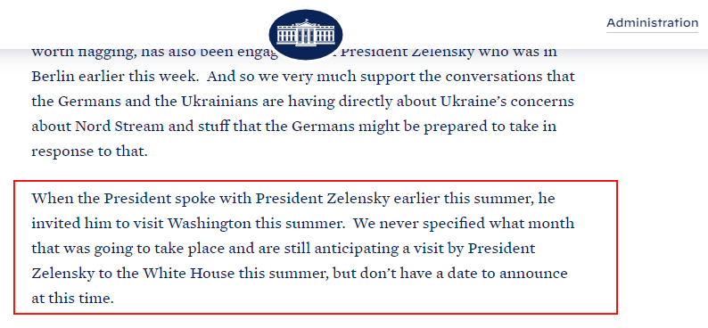 "Когда этим летом президент разговаривал с президентом Зеленским, он пригласил его посетить Вашингтон этим летом. Мы никогда не уточняли, в каком месяце это будет происходить, и все еще ожидаем визита президента Зеленского в Белый дом этим летом, но пока не можем объявить дату", - говорится в сообщении