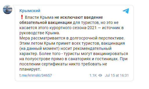 "Этим летом Крым примет всех туристов, вакцинация (на данный момент) носит рекомендательный характер. Более того - туристы могут вакцинироваться на полуострове прямо в санаториях и гостиницах. При поселении сертификаты никто требовать не планирует", - говорится в сообщении.