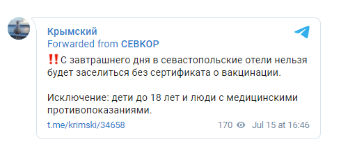 Между тем появилась информация, что уже с пятницы, 16 июля, в севастопольские отели нельзя будет заселиться без сертификата о вакцинации. Исключение составляют дети до 18 лет и люди с медицинскими противопоказаниями.