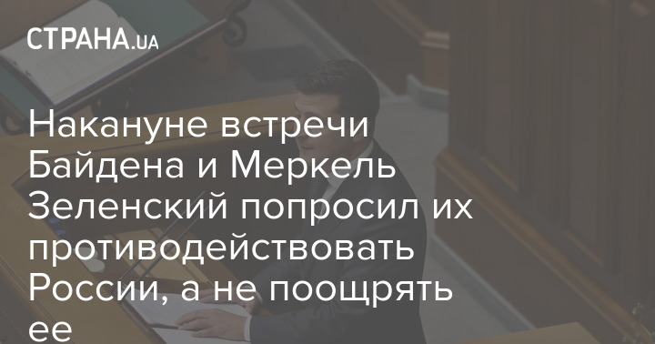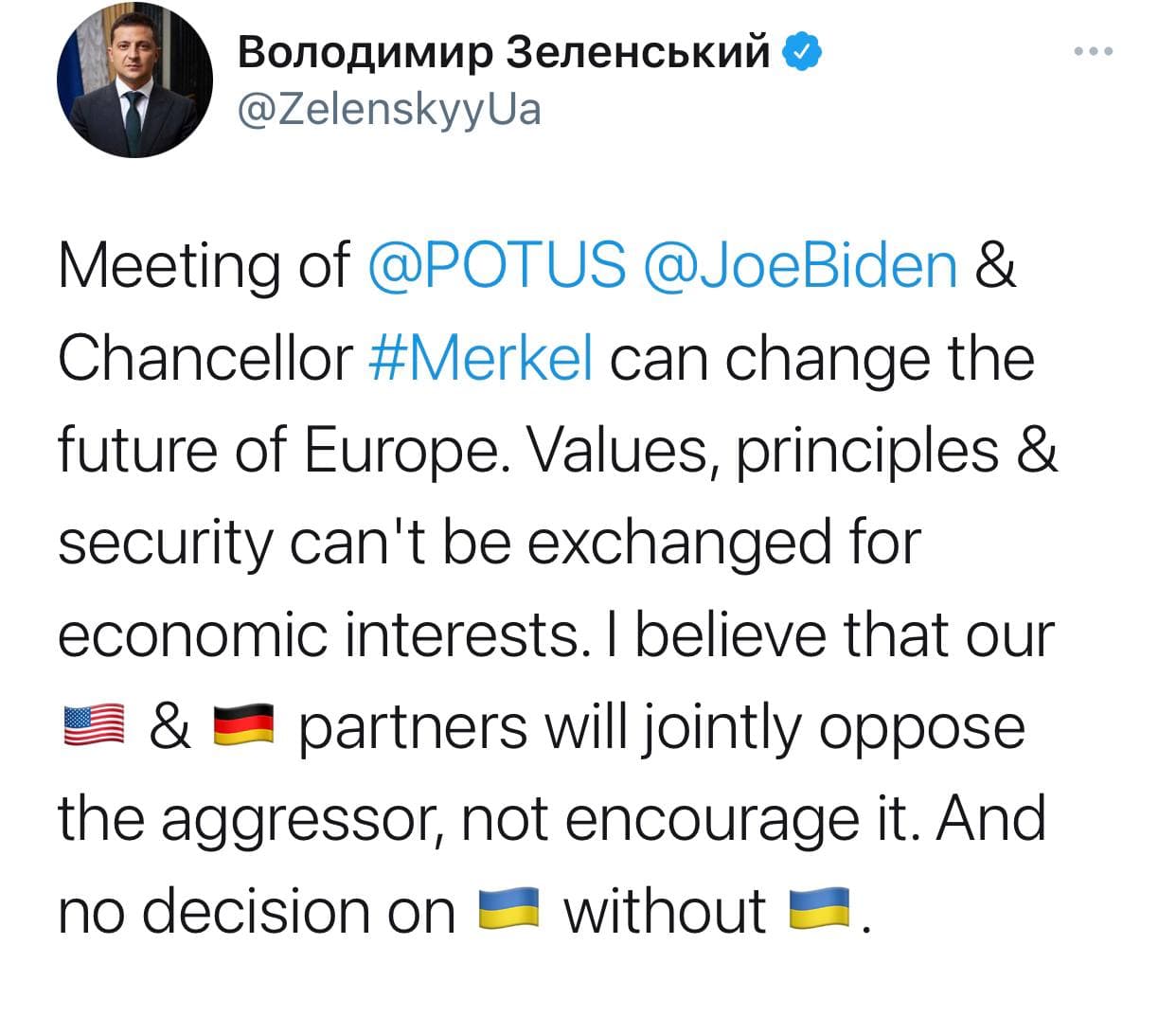 Накануне встречи лидеров США и ФРГ Джо Байдена и Ангелы Меркель президент Украины Владимир Зеленский написал сообщение в твиттере, в котором выразил мнение, что два лидера будут противостоять России, а не поощрять ее. Также он надеется, что те не примут решений по Украине без нее.