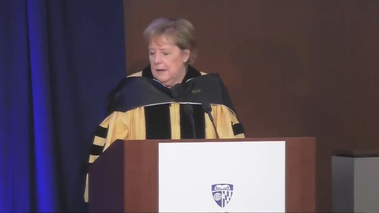 На церемонии Меркель говорила по-немецки, при этом перевод на английский не транслировался. Канцлер в ответном слове отметила, что мир хочет вернуться к нормальной жизни после пандемии коронавируса. Она также рассказала, что пользуется статистическими данными университета о пандемии.