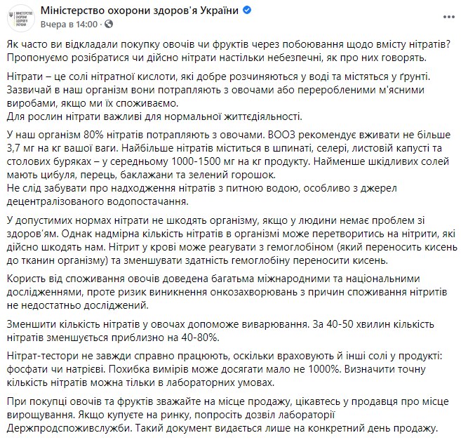 В организм человека 80% нитратов попадают с овощами, однако избыточное количество нитратов в организме может превратиться в нитриты, которые несут вред. Одним из последствий может стать риск возникновения онкозаболеваний из-за потребления нитритов.
