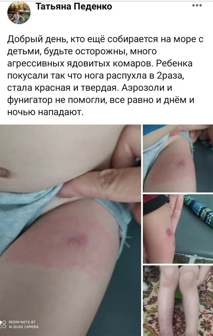 "Кто ещё собирается на море с детьми, будьте осторожны, много агрессивных ядовитых комаров. Ребенка покусали так, что нога распухла в два раза, стала красная и твердая. Аэрозоли и фумигатор не помогли, все равно и днём и ночью нападают", - писала Татьяна. Женщина отмечает, что им пришлось вызывать "скорую помощь" для ребенка. Медики сделали укол чтобы снять воспаление.