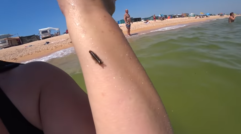 Местные жители сообщают, что помимо нескольких медуз встречали в море мелких ракообразных, которые больно кусают. Это так называемые "морские блохи". При этом температура воды на Арабатской стрелке около 30 градусов.